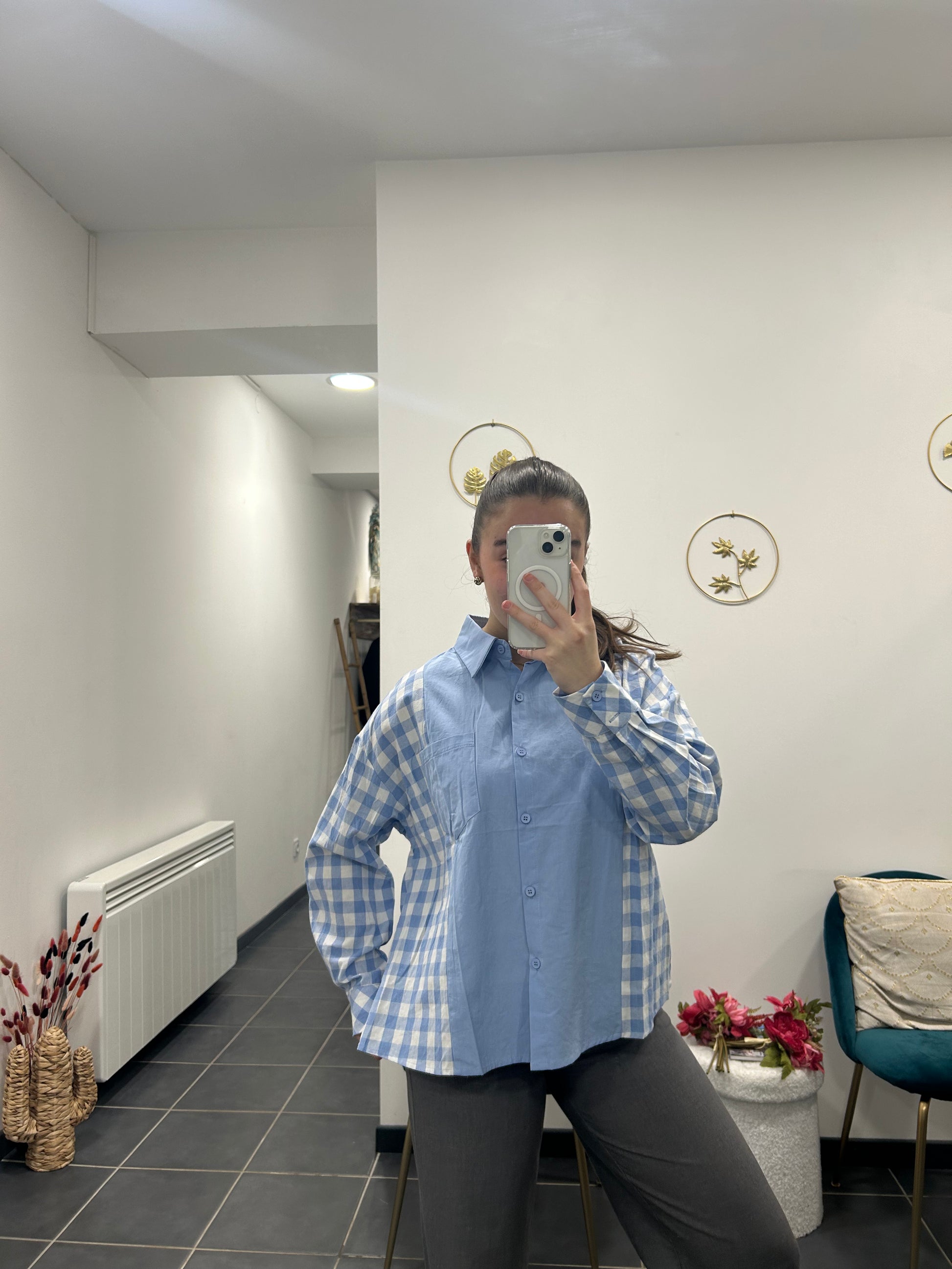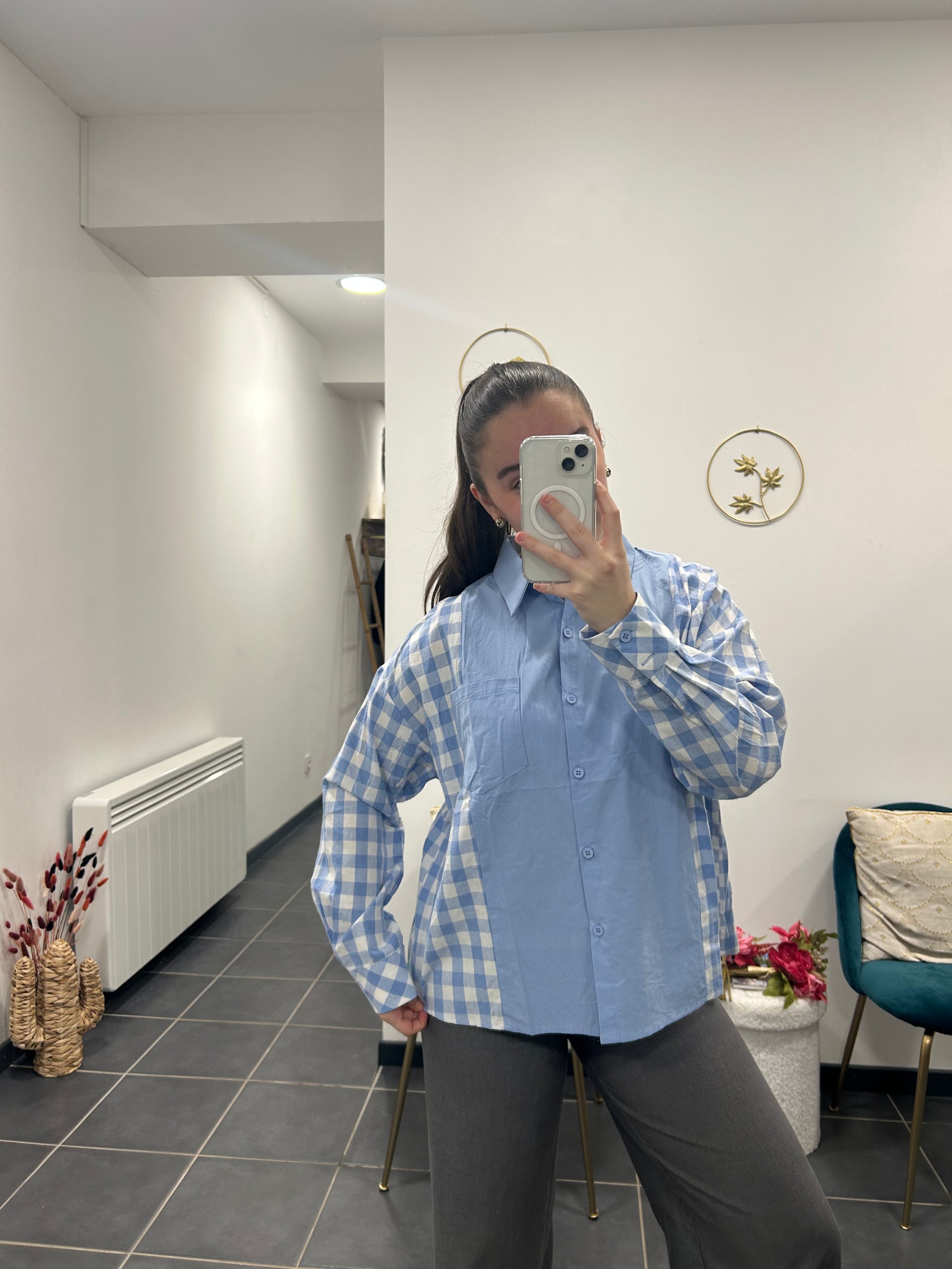 Ce chemisier bleu à carreaux est une pièce facile à porter au quotidien. Sa coupe confortable et son motif intemporel apportent une touche décontractée tout en restant soignée. Il se porte aussi bien avec un jean pour un look casual qu’avec un pantalon plus habillé pour une tenue plus chic.