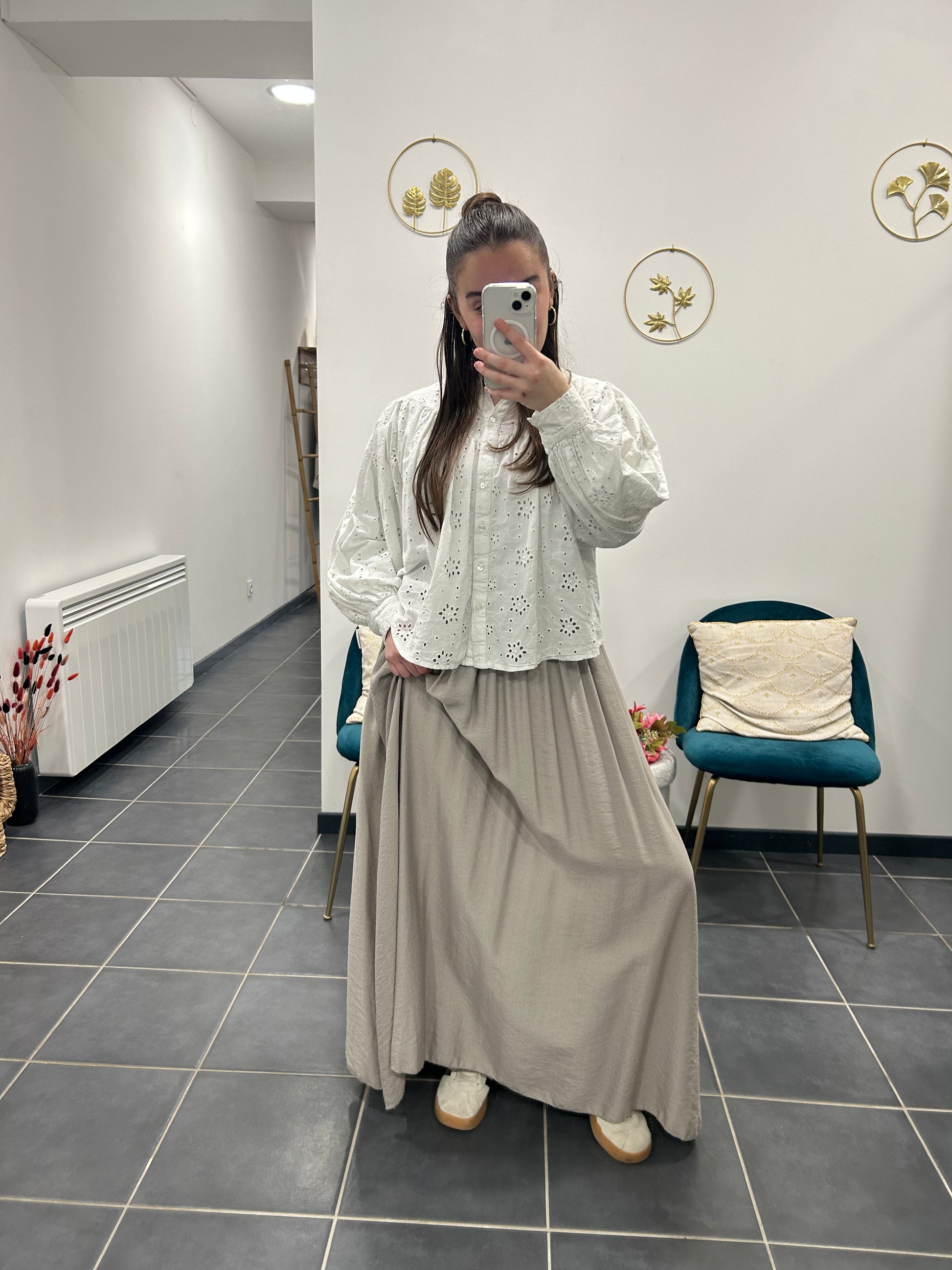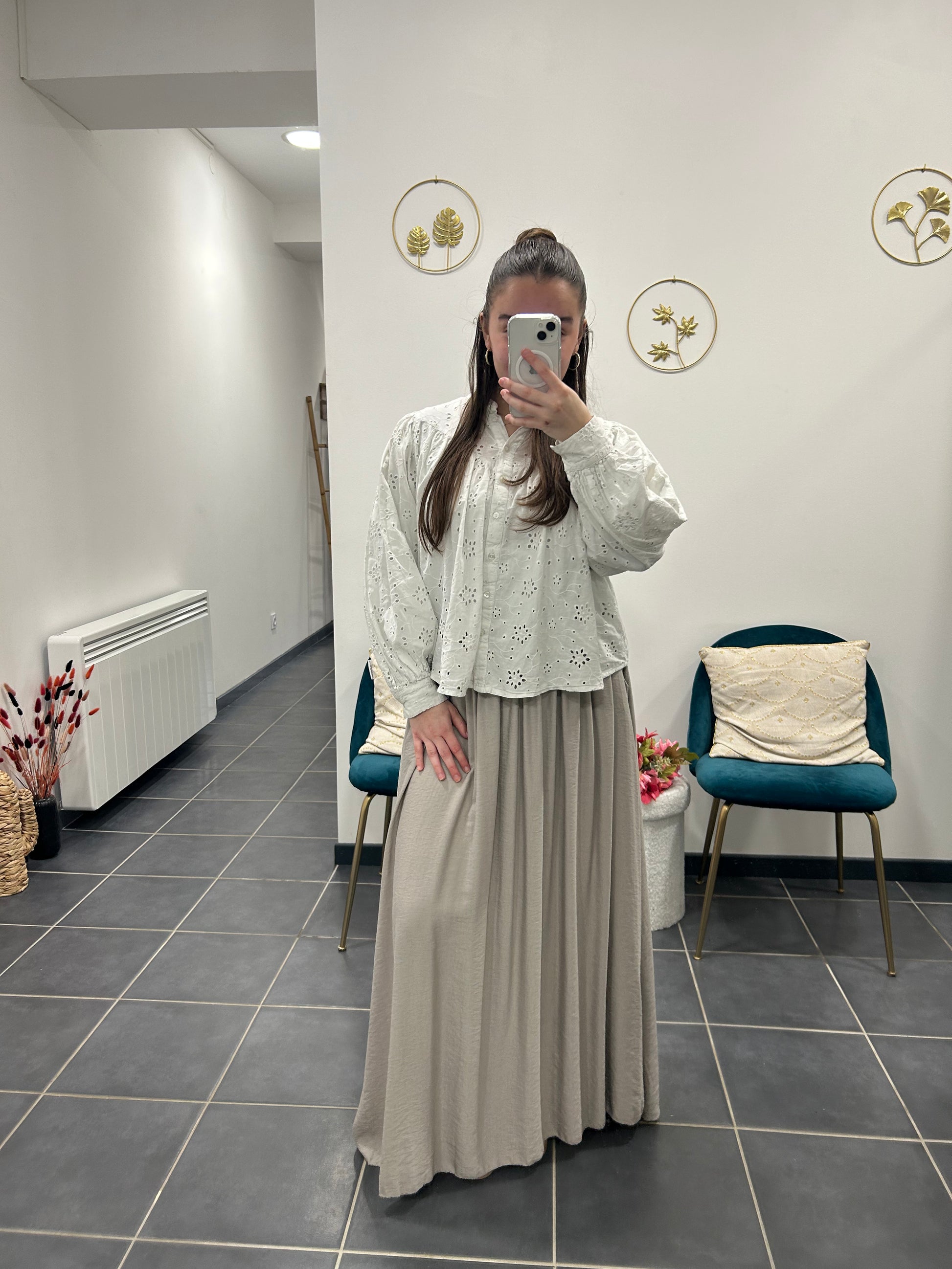 Cette jupe beige est une pièce élégante et facile à porter. Sa couleur douce s’associe facilement avec différents hauts pour créer des tenues simples et harmonieuses. Confortable et légère, elle convient aussi bien pour le quotidien que pour une occasion plus habillée.